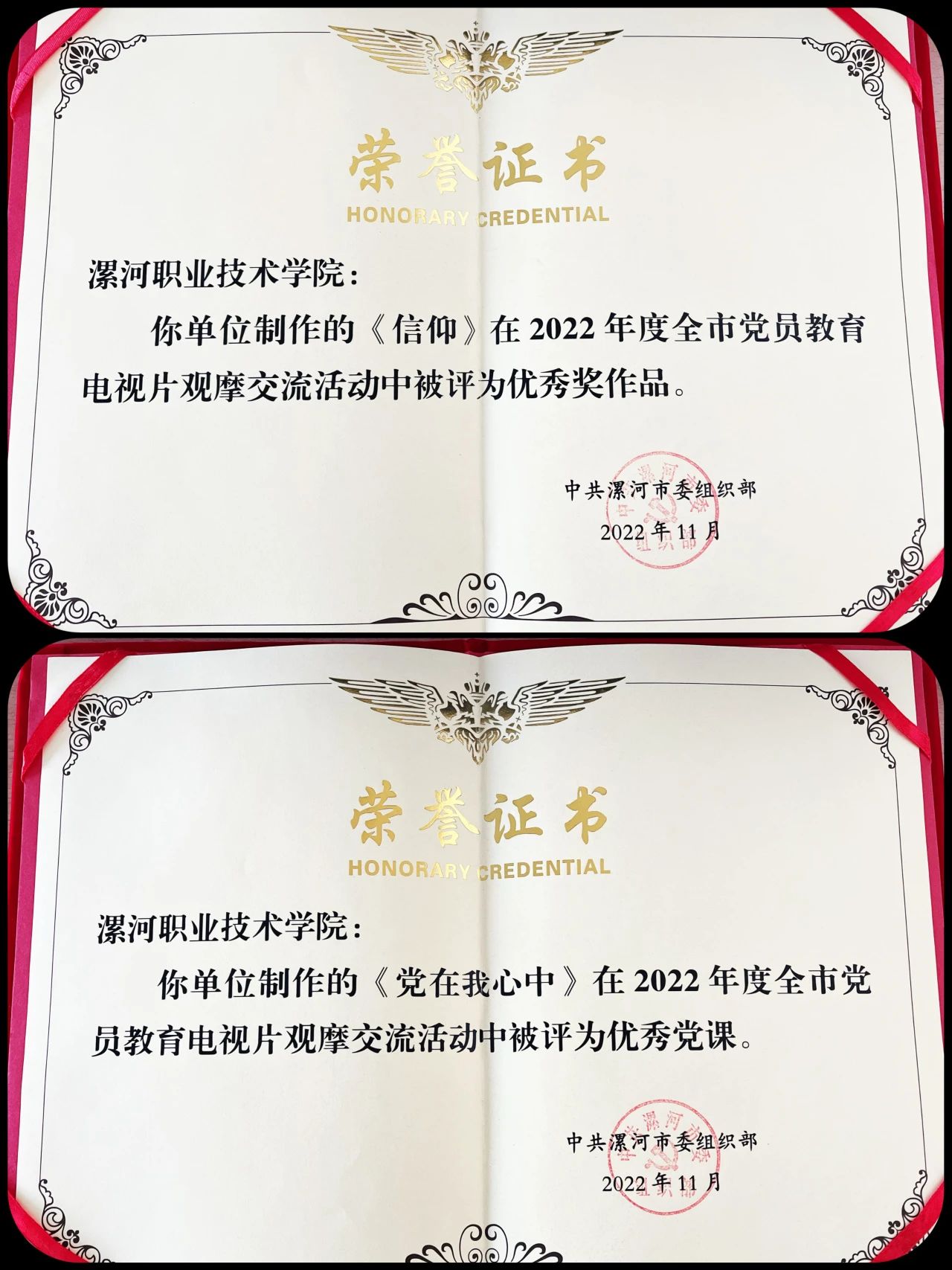 在全国第四届“诵读中国”大赛中荣获优秀奖、在河南省第四届经典诵读大赛中荣获一等奖、在河南省“喜迎二十大 欢乐进万家”十大群众文化活动中获得二等奖、在漯河市第十八届经典诵读大赛中荣获冠亚军、值得一提的是在刚刚结束的河南省第五届经典诵读大赛中我们的两个作品《我们》《青春担当》荣获一等奖,并成功入围由教育部、国家语委主办的全国总决赛。