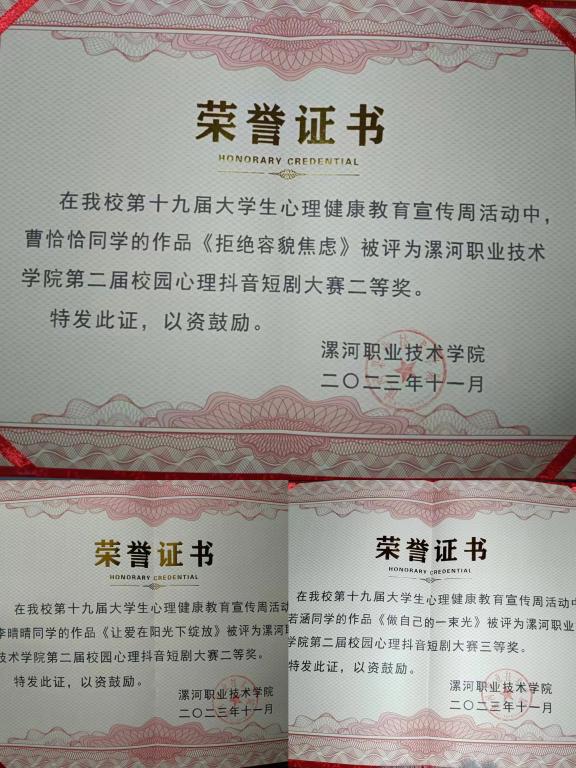 为深入贯彻落实河南省教育厅办公室《关于开展2023年度全省高校心理健康教育宣传周活动的通知》文件精神,学习贯彻党的二十大精神,贯彻落实习近平总书记关于加强员工心理教育工作的重要指示精神,公司成功举办了第十九届老员工心理健康教育宣传周活动。旅游酒店管理系对此项活动高度重视,其中在心理健康抖音短剧大赛中,组织22级,23级全体在校员工参与比赛,经过班级,系,校级层层选拔,共推选出9个作品参与公司心理健康抖音短剧大赛,其中获奖5个作品。一等奖2个,二等奖2个,三等奖1个,作品分别《微笑让生活更好》,《和谐心灵,健康美好》荣获校园一等奖,作品《让爱在阳光下绽放》《拒绝容貌焦虑》荣获校园二等奖,作品《做自己的一束光》荣获三等奖。
