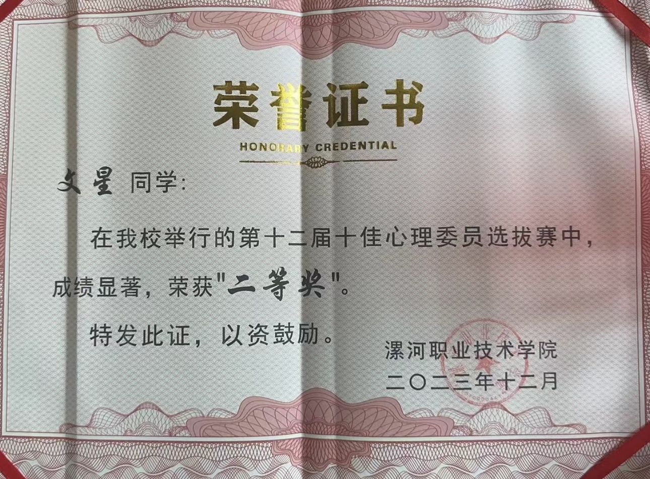 11月11日,为进一步加强公司心理健康教育工作中班级心理委员建设,发挥心理委员在心理健康教育方面的作用,表彰先进,树立典型,促进和谐校园构建。由校学工部、员工处主办的第十二届十佳心理委员选拔赛决赛在校大礼堂成功举行。此次活动,历时一个月,经过了初赛、复赛、决赛。其中,旅游与酒店管理系学子文星在“心情绽放之我型我秀才艺展示”决赛中表现突出,荣获二等奖。
