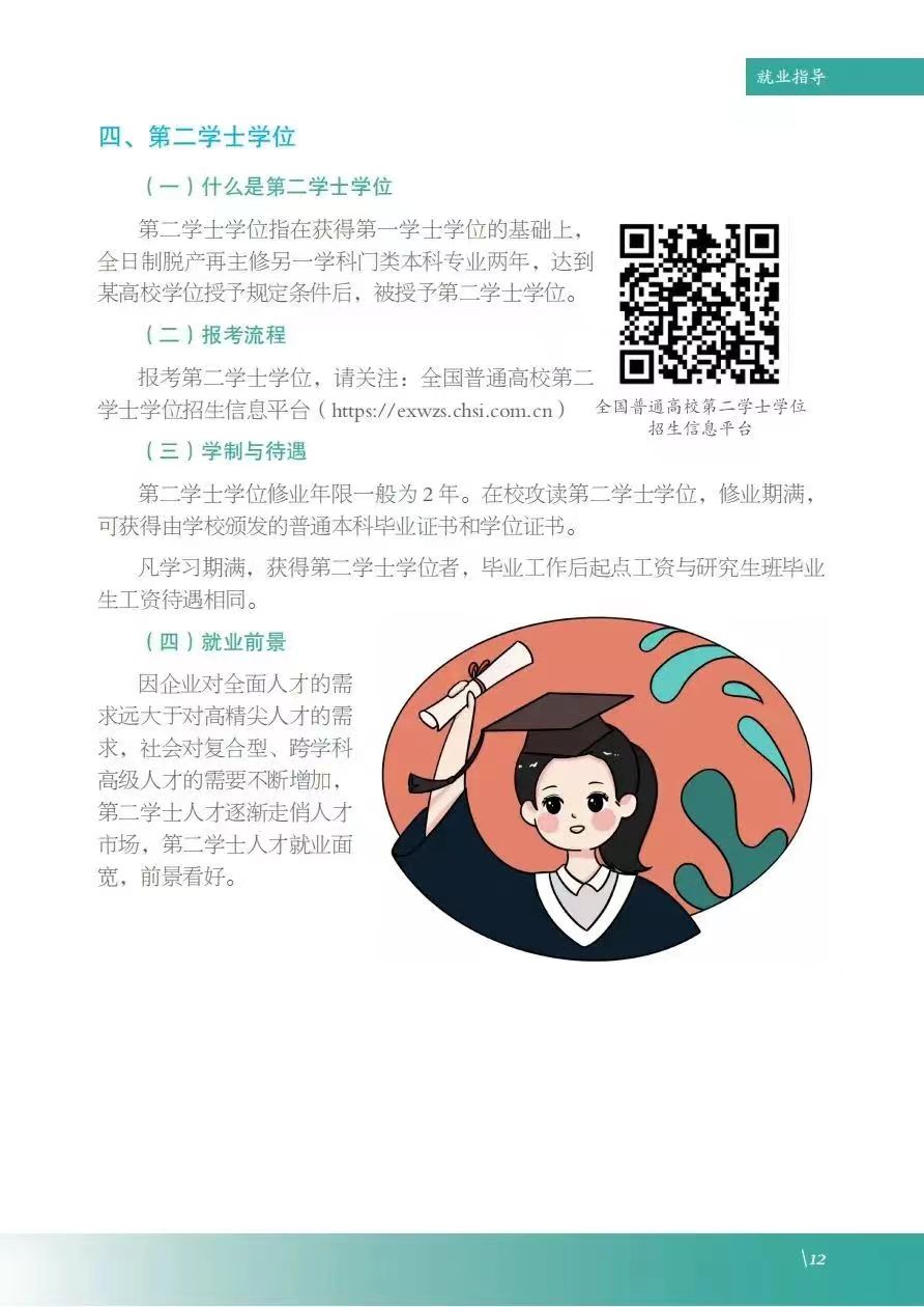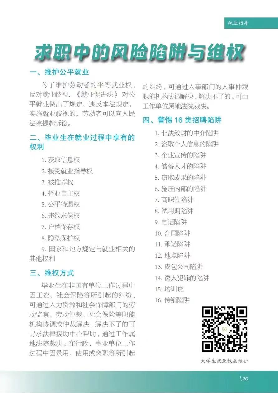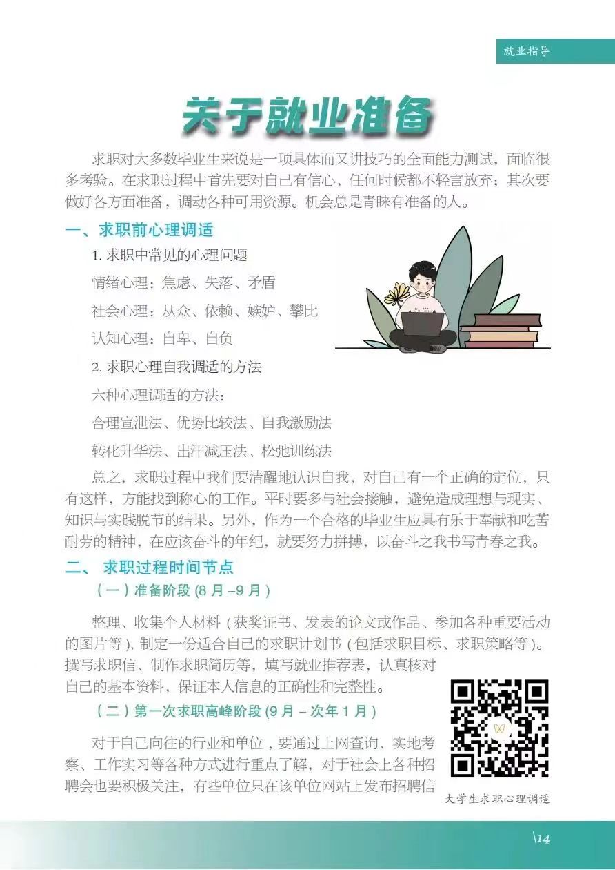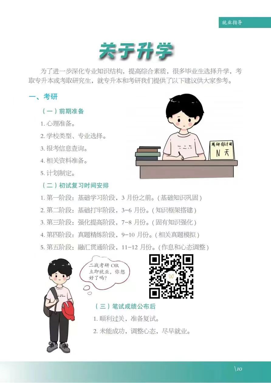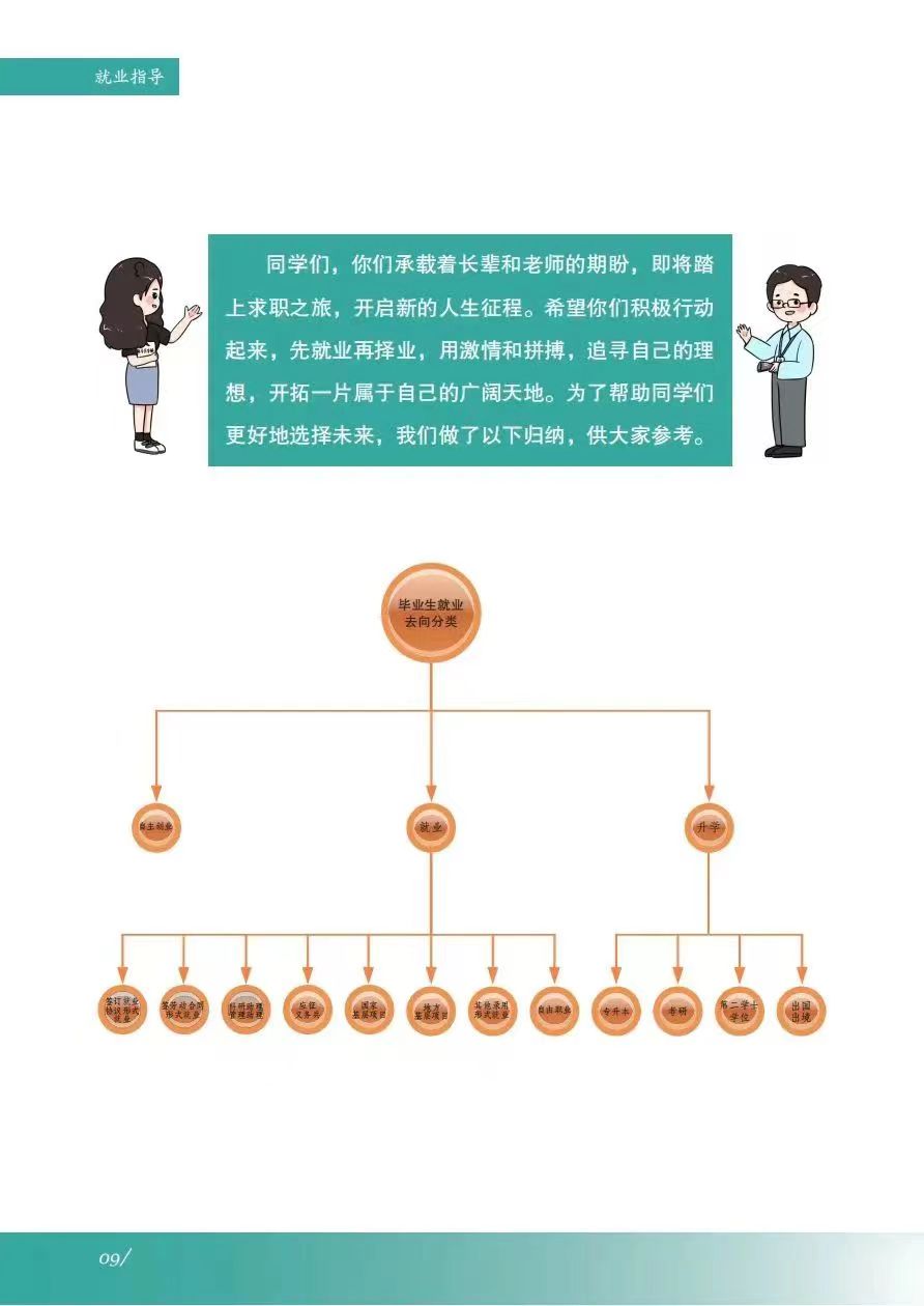 《服务指南》涵盖政策摘要、就业指导、政策性岗位介绍、就业服务等内容,其中政策摘包含灵活就业、自主创业、应征入伍等;就业指导包含升学、考公考编、就业准备、权益维护等;政策性岗位介绍包含三支一扶、选调生、特岗教师、科研助理岗等;就业服务包含毕业生签约流程、就业手续办理、档案及党团组织关系转递、就业信息获取渠道及就业主管部门通讯录等。