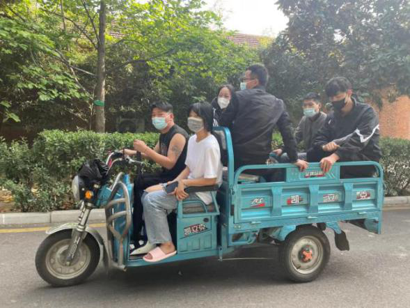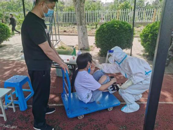 近期每一天的核酸检测给脚部受伤的王云青带来了不小的麻烦,下楼到操场的核酸检测点有很长一段距离,院领导在得知此情况后,现场协调工作人员,借来了推车和三轮车,推着员工完成了核酸采集,并且安排三轮车送员工到宿舍。