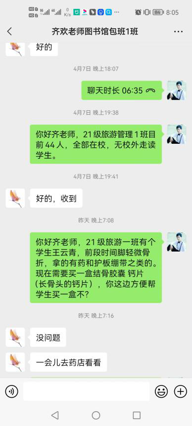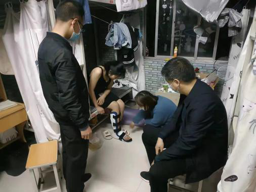 21级旅游管理一班的王云青同学因为一次起身急走,崴到了脚,原本以为只是一次普通的崴脚,谁知两三天后脚部浮肿淤青,糟糕的情况引起了辅导员的重视,辅导员立即向院领导汇报,得到批准后及时办理外出请假手续,由校保卫处派车将员工送至漯河医专三附院。公司年轻的辅导员老师李普一用轮椅推着员工挂号、就诊、检查、拿药,全程陪伴照顾。王云青同学被医生诊断为轻微骨折,需要到药店购买肢具和绷带进行固定,并且脚不能离地。此时公司正处于封闭管理状态,校内师生没法出门买药。吴筱艾老师赶忙联系校外志愿者帮忙,食品公司贾娟老师看见求助信息后第一时间将家里的弹力绷带和肢具送到公司,确保员工能尽快固定住脚部,不耽误脚骨的愈合。此后,每天去查寝时,院领导和老师们总特地前往王云青宿舍,查看她脚部恢复情况。为更快的愈合脚骨,听说需要配合药物治疗时,公司包班党员图书馆齐欢老师又在第一时间帮员工购买了五盒节骨胶囊。