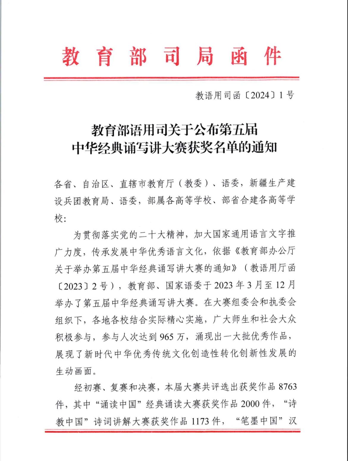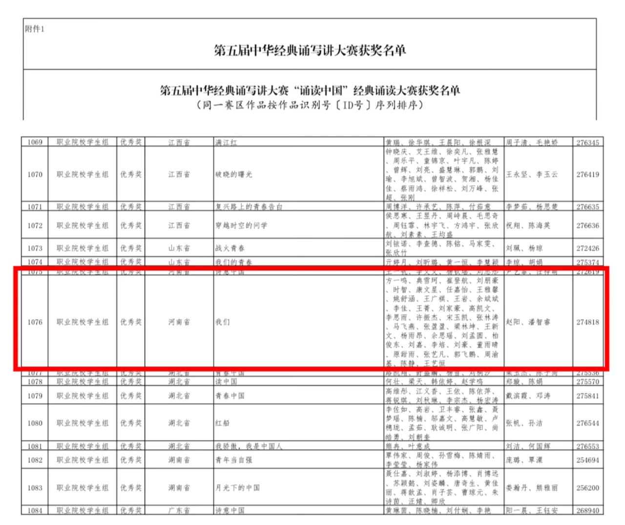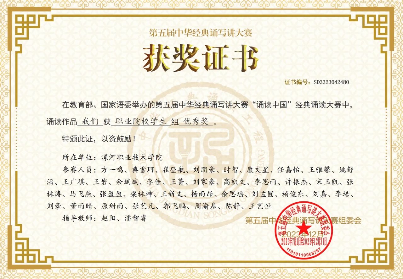 近日,全国第五届中华经典诵写讲大赛“诵读中国”经典诵读大赛获奖名单公示,由公司旅游与酒店管理系赵阳、潘智睿老师创作指导的朗诵作品《我们》荣获国家级优秀奖。