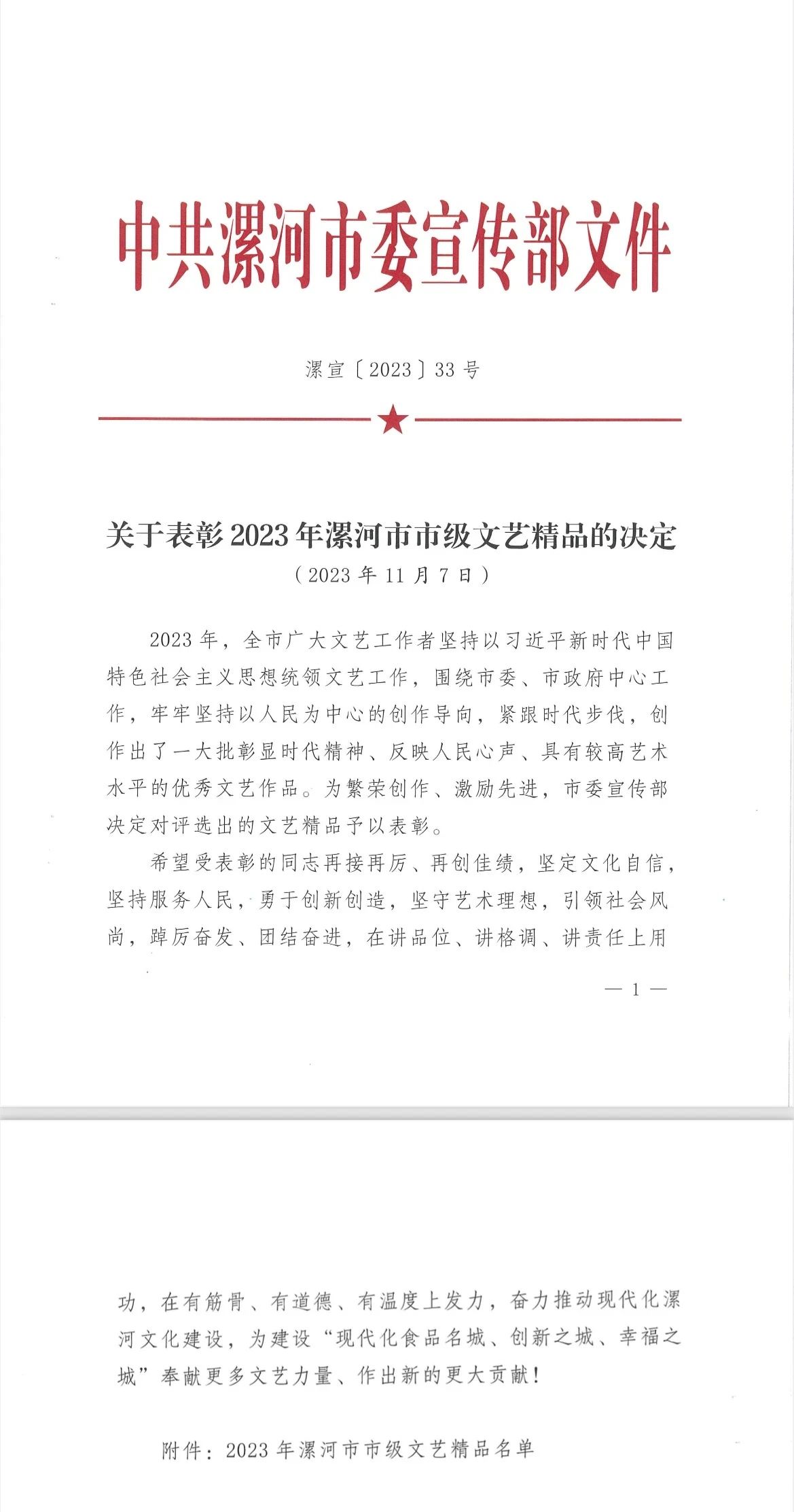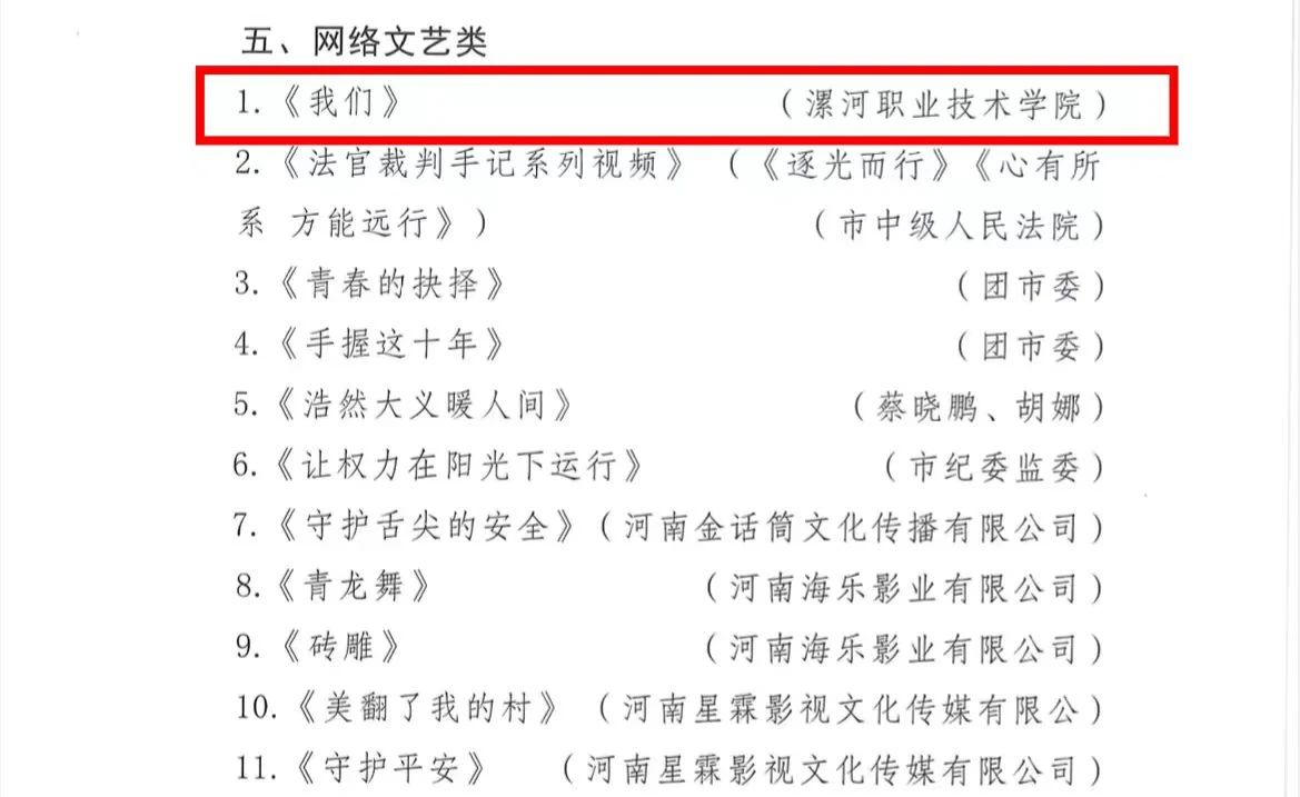 近日,由中共漯河市委宣传部主办的2023年漯河文艺精品评选活动获奖名单公布,yl7703永利旅游与酒店管理系报送的原创作品《我们》被评为网络文艺类市级文艺精品。