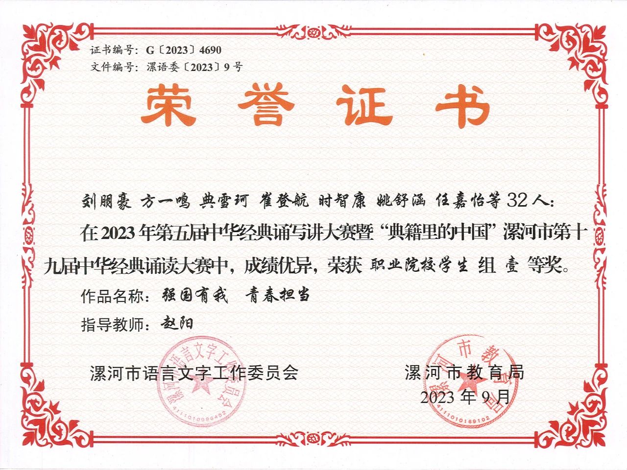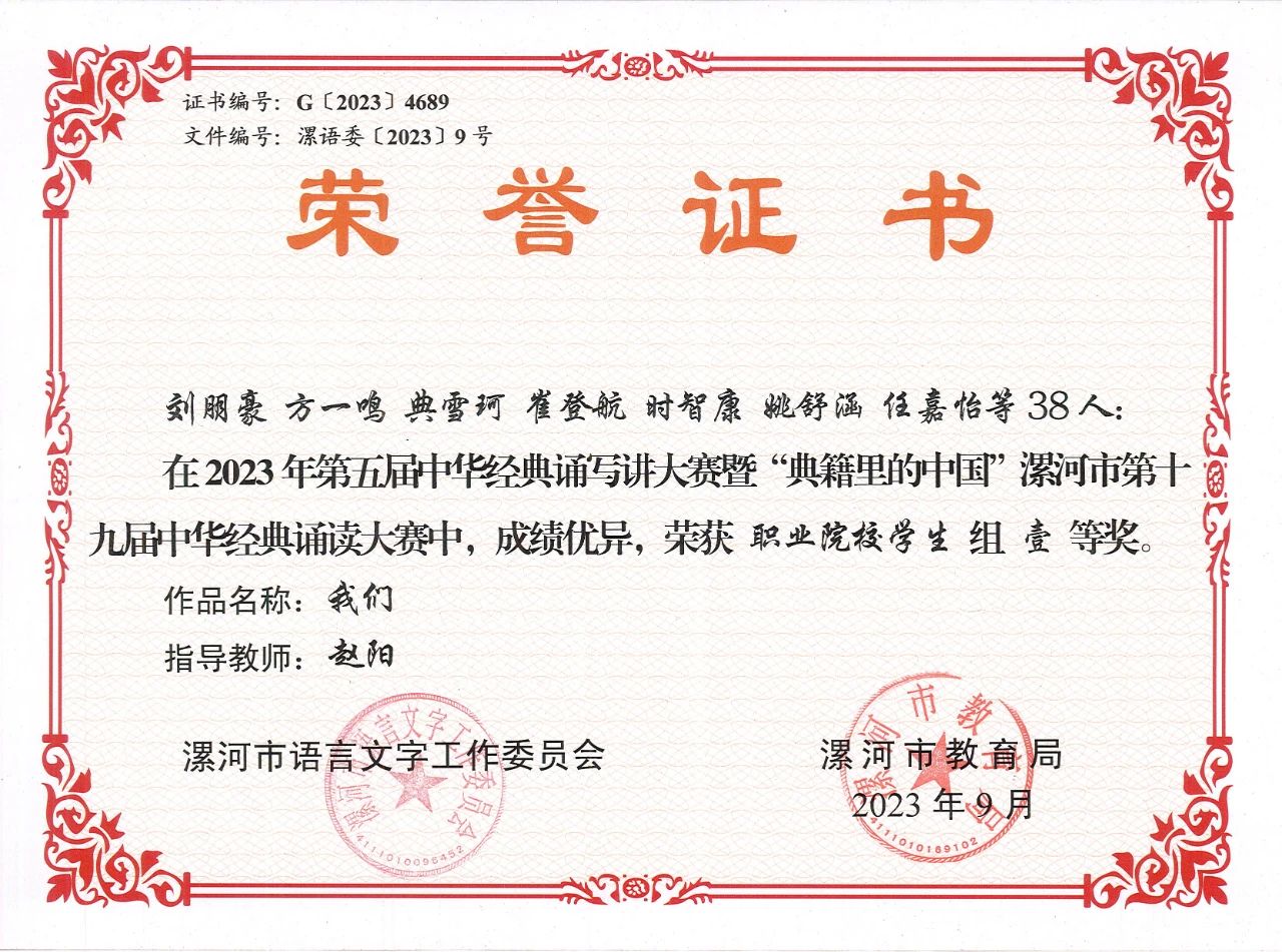 近日,由漯河市语言文字工作委员会、漯河市教育局主办的2023年第五届中华经典诵写讲大赛暨漯河市第十九届中华经典诵读大赛落下帷幕,公司旅游与酒店管理系选送的作品《我们》《强国有我 青春担当》斩获职业院校组冠亚军,并获一等奖。