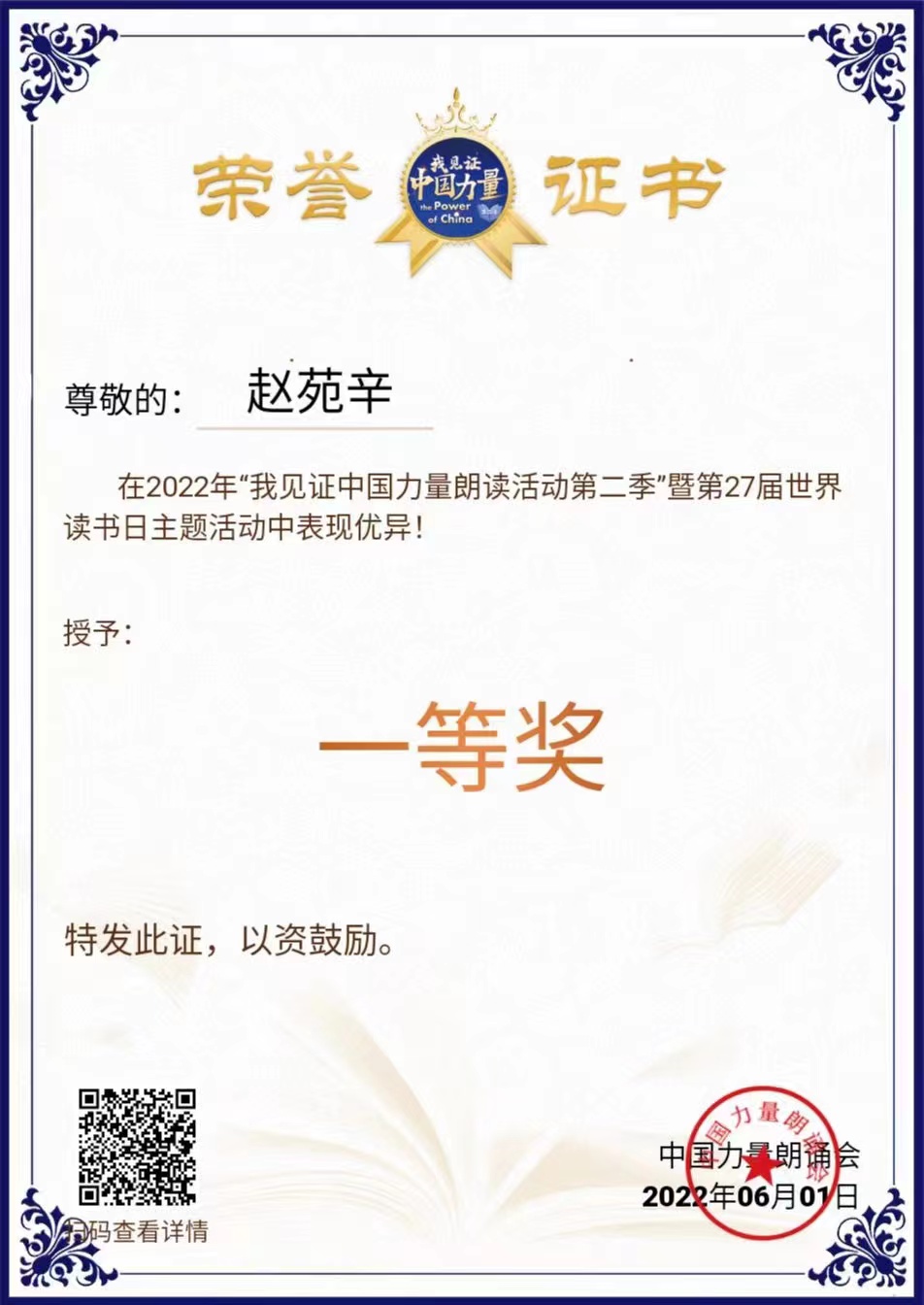 近日,由教育部语言文字应用研究所、中国国家图书馆、央视频、华东师范大学出版社、中国国际广播出版社、中国力量朗诵会、央广云听、新华社中国搜索、优谷朗读研究院等单位联合发起举办的第二季“我见证中国力量”主题朗诵比赛暨第27届世界读书日主题活动圆满落幕。yl7703永利21级民航二班赵苑辛原创朗诵作品《青春绽放异彩 喜迎建团百年》。经过专业评审团评审,在全国众多参赛高校中脱颖而出,荣获老员工组全国第二名并获一等奖!