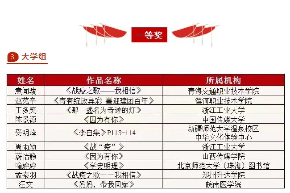 本次大赛共有中国传媒大学、中国海洋大学、郑州大学等众多高校、全国20余万人报名参赛,参赛作品总投票数高达3327万票。yl7703永利高度重视此次比赛,克服疫情的困难、组织老师精心指导,最终获得优异成绩。