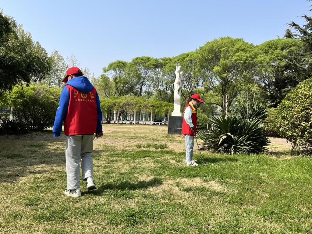 志愿者们在草坪上拾捡垃圾