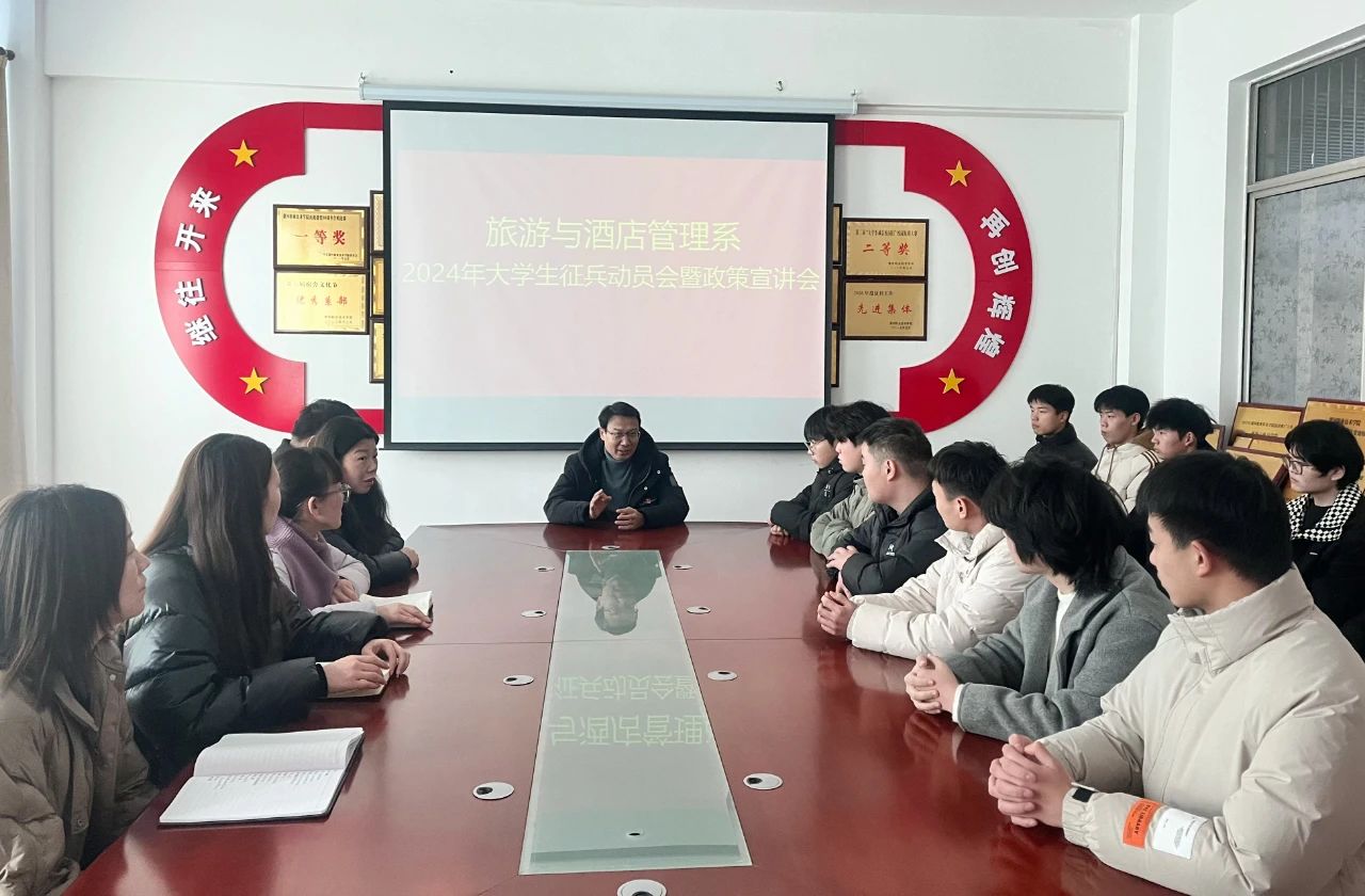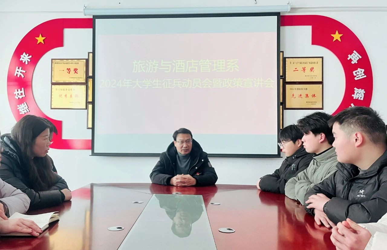 为响应国家征兵号召,扎实做好2024年征兵工作,使同学们进一步了解老员工应征入伍的相关优待政策,鼓励和引导老员工积极应征入伍,激发员工报效祖国的热情,旅游与酒店管理系在系会议室举办2024年老员工征兵动员会暨政策宣讲会。系党总支书记耿鹏坤、学管负责人潘智睿、全体辅导员以及员工代表参加会议。