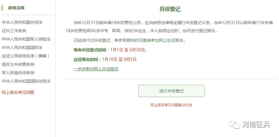 在这个页面中,会告知我们报名时间以及参军的政策说明,建议看后,点击“进行兵役登记”,迈出你军旅生涯的第一步吧!