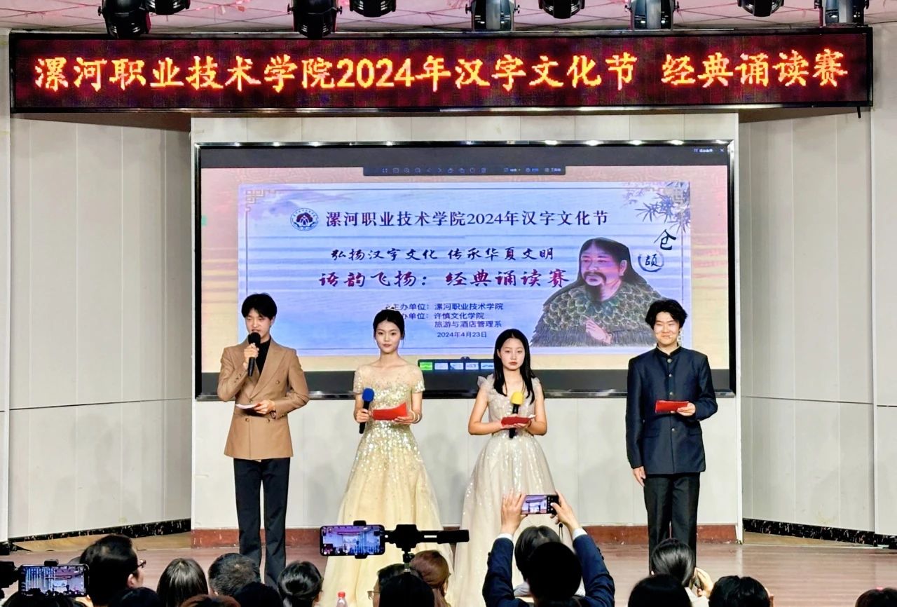雅言传承文明,经典浸润人生。为传承许慎精神,弘扬汉字文化,让师生充分感受中华经典的意蕴之美、韵律之美,4月23日晚上,公司隆重举办以“语韵飞扬”为主题的中华经典诵读赛。本次比赛是公司2024年“汉字文化节”系列活动之一,由旅游与酒店管理系承办,旅游与酒店管理系和许慎文化公司领导和部分师生参加了本次活动。
