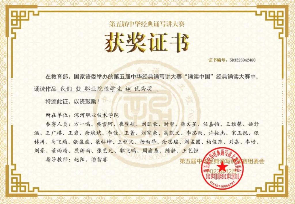 近日,全国第五届中华经典诵写讲大赛“诵读中国”经典诵读大赛获奖名单公示,由公司旅游与酒店管理系赵阳、潘智睿老师创作指导的朗诵作品《我们》荣获国家级优秀奖。