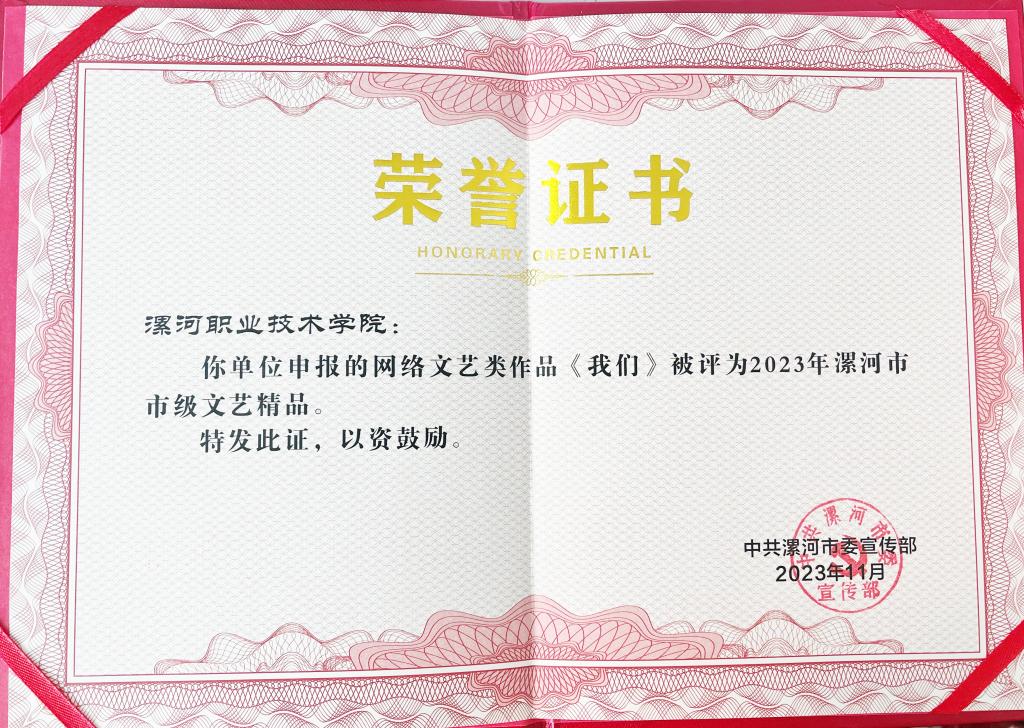 近日,由中共漯河市委宣传部主办的2023年漯河文艺精品评选活动获奖名单公布,yl7703永利旅游与酒店管理系报送的原创作品《我们》被评为网络文艺类市级文艺精品。