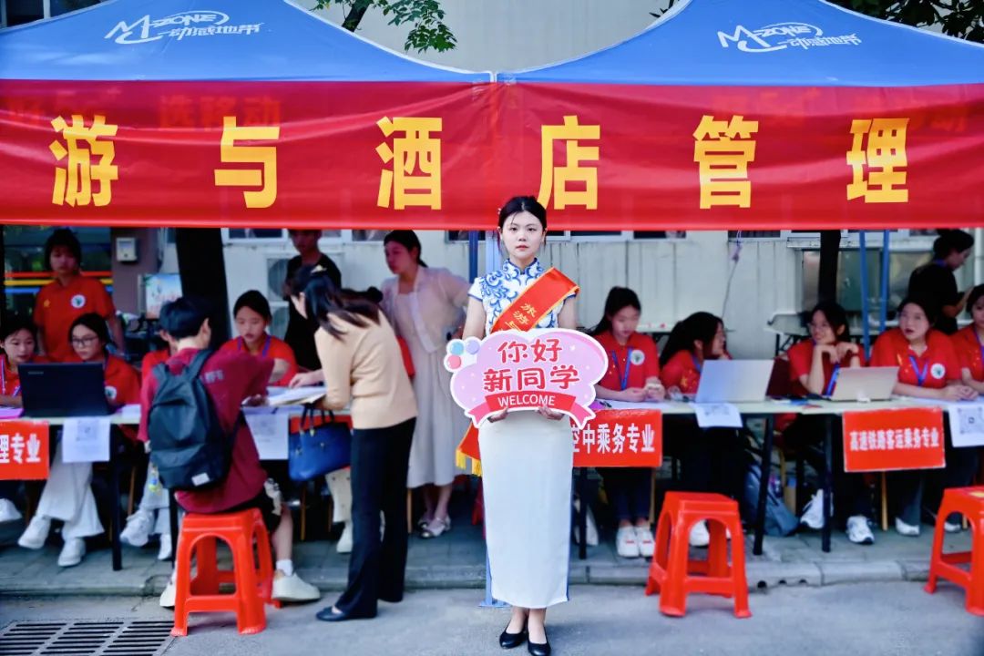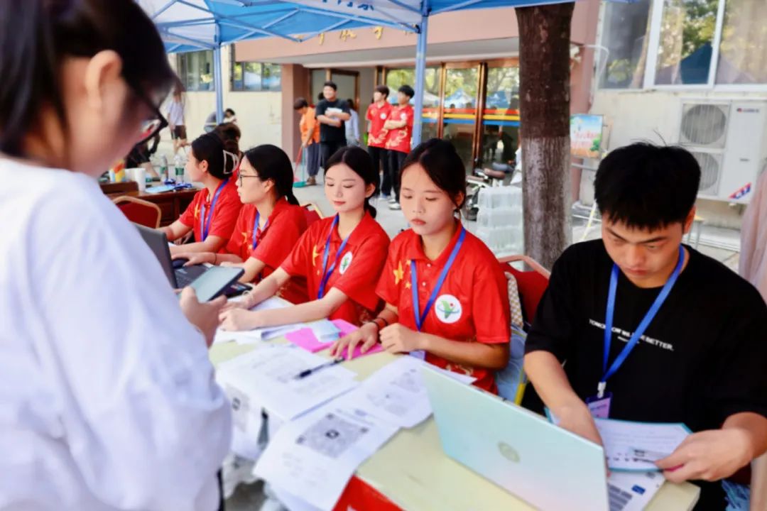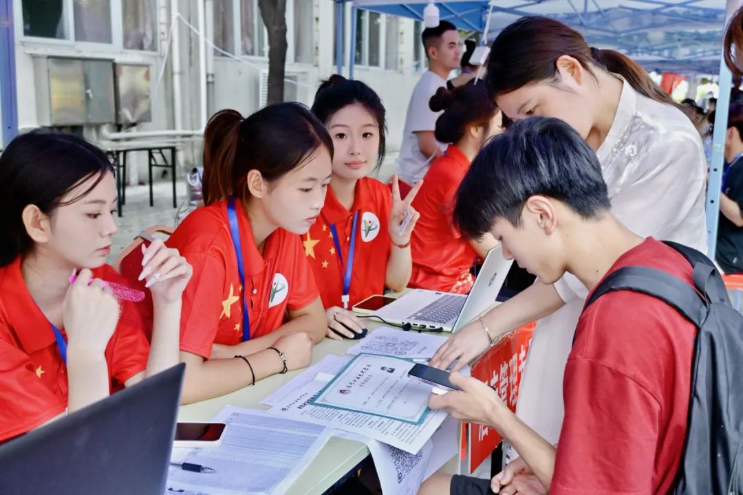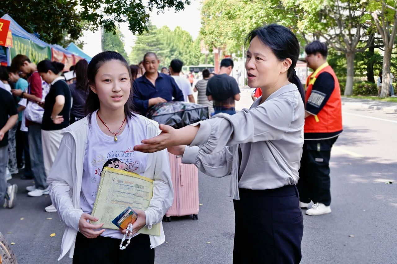 工作人员热情迎接每位新生