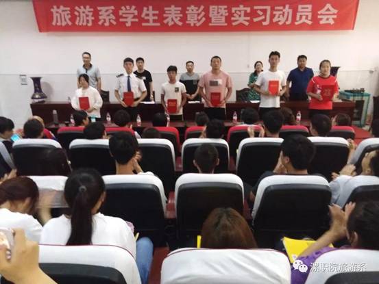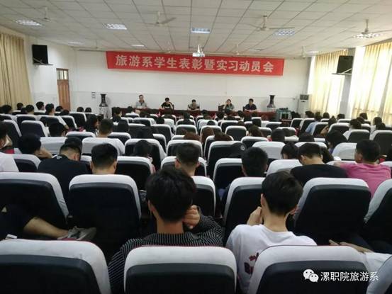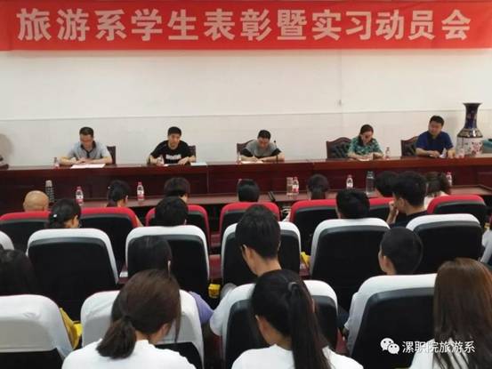 6月11日下午5:00,旅游系在三号教学楼3101会议室召开本学年员工活动总结表彰暨实习动员大会。大会由办公室主任侯冰主持,系主任王世锋、副主任冯俊强、张二霞,团总支书记潘智睿、各年级辅导员、教研室主任、实习指导教师以及2017级全体专业全体同学参加了会议。