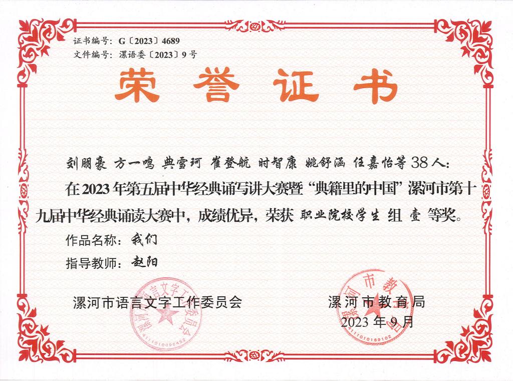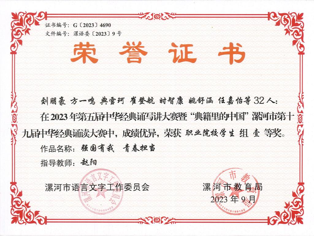 近日,由漯河市语言文字工作委员会、漯河市教育局主办的2023年第五届中华经典诵写讲大赛暨漯河市第十九届中华经典诵读大赛落下帷幕,公司旅游与酒店管理系选送的作品《我们》《强国有我青春担当》斩获职业院校组冠亚军,并获一等奖。