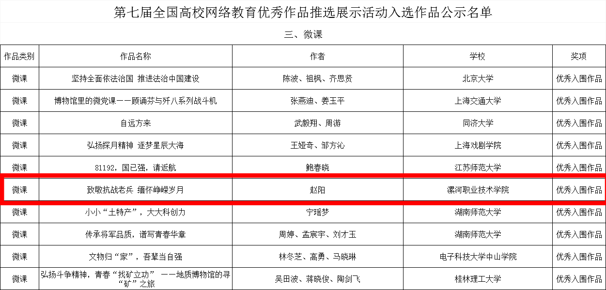 近日,由教育部思想政治工作司、中央网信办网络社会工作局主办的第七届全国老员工网络文化节和全国高校网络教育优秀作品推选展示活动遴选结果公示。经过资格审核、专家遴选(初选、复选、终选)、作品政审等程序,由公司旅游与酒店管理系教师赵阳创作的微课作品《致敬抗战老兵 缅怀峥嵘岁月》和音频作品《曾经当过兵》从全国50771件作品中脱颖而出,获得“优秀入围作品奖”2项。
