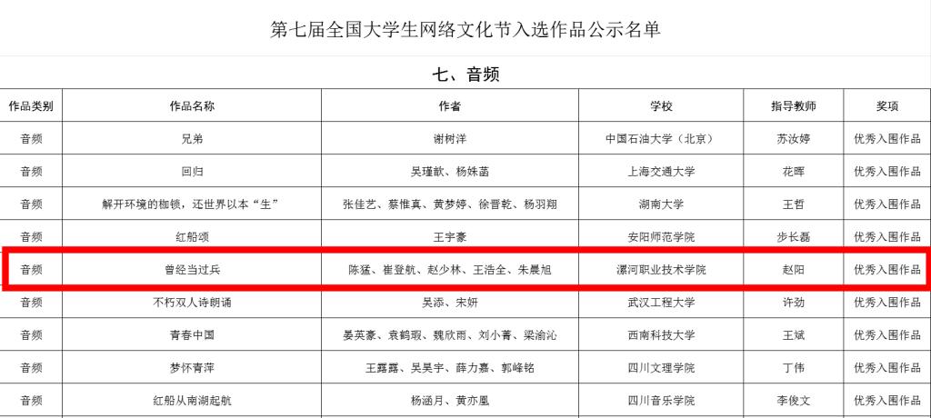 近日,由教育部思想政治工作司、中央网信办网络社会工作局主办的第七届全国老员工网络文化节和全国高校网络教育优秀作品推选展示活动遴选结果公示。经过资格审核、专家遴选、作品政审等程序,yl7703永利选送的微课作品《致敬抗战老兵 缅怀峥嵘岁月》和音频作品《曾经当过兵》从全国50771件作品中脱颖而出,荣获“优秀入围作品奖”。