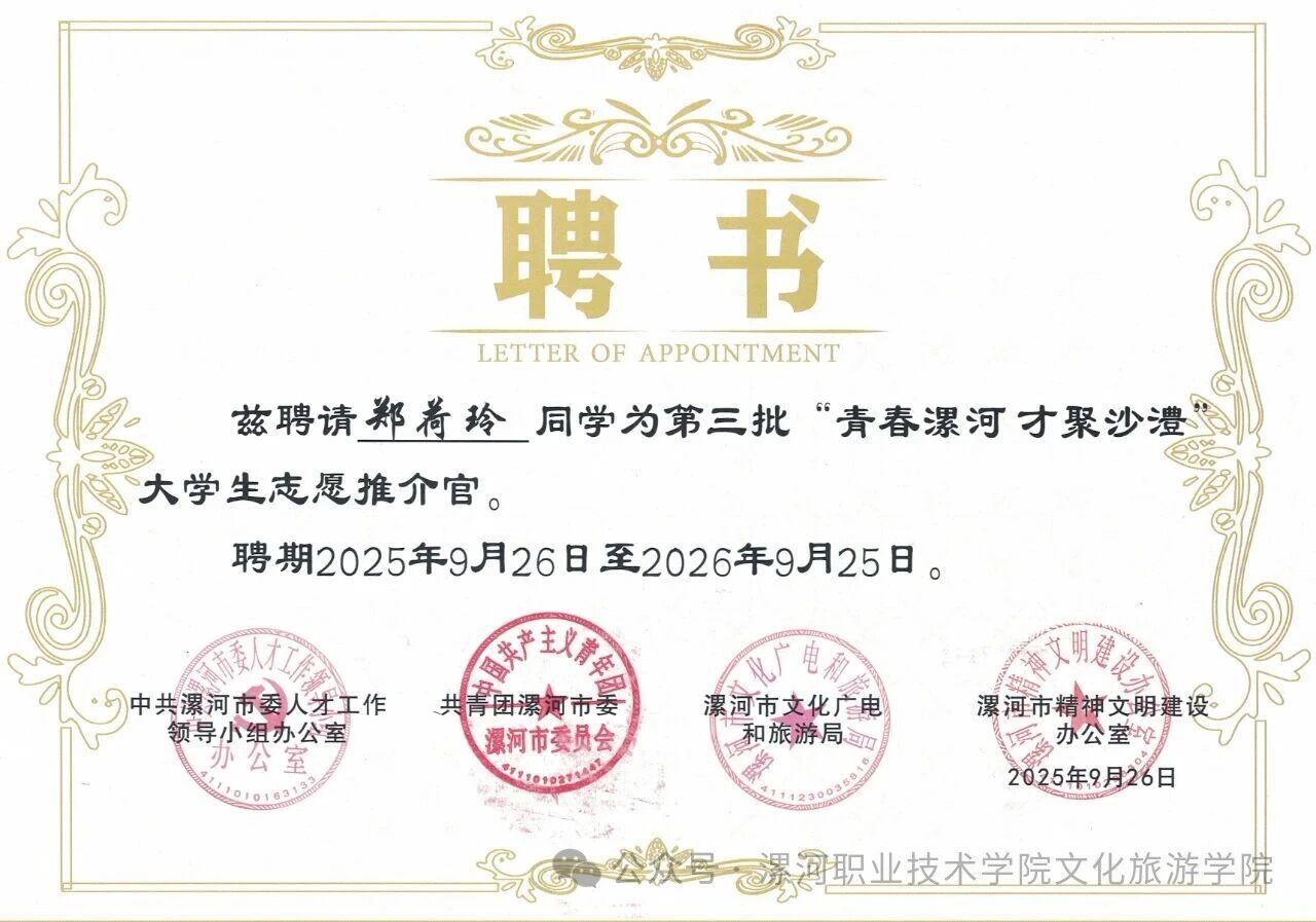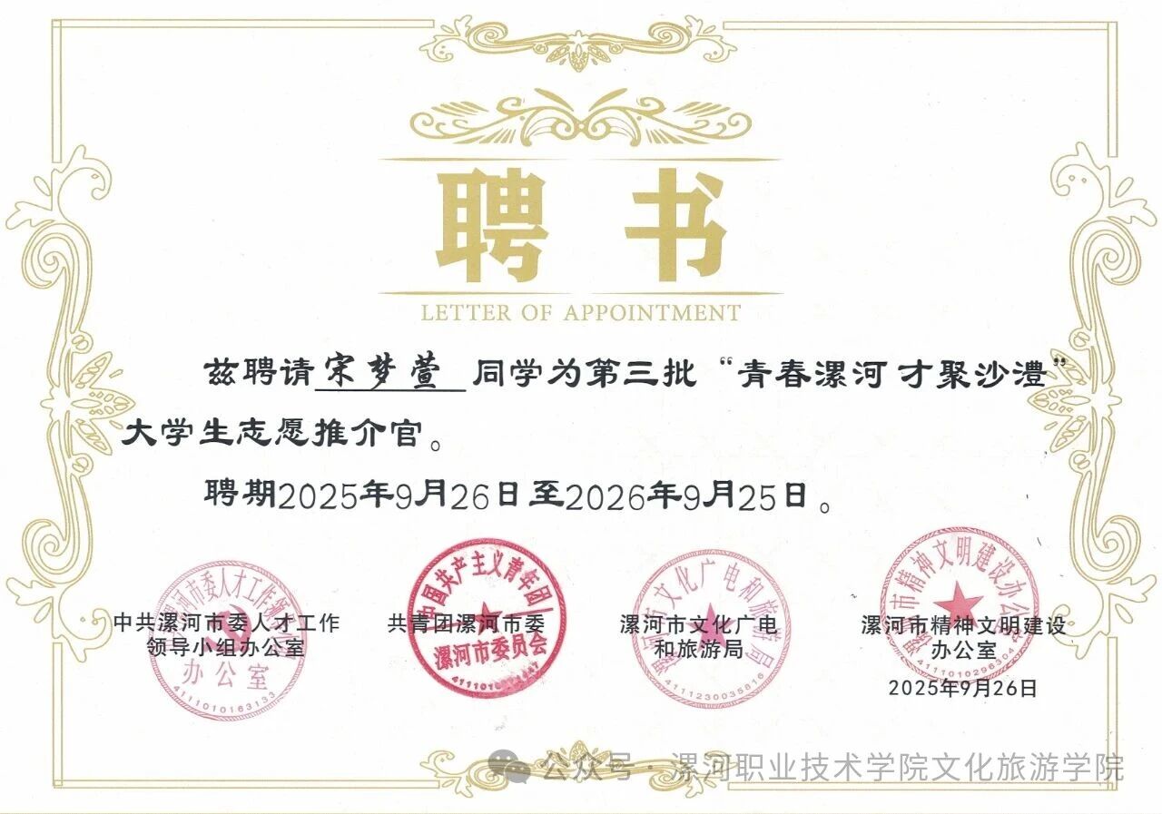 近日,从漯河市委人才办、市文明办、市文旅局、共青团市委联合举办的第三批“青春漯河 才聚沙澧”老员工志愿推介官招募活动中传来喜讯,公司郑荷玲、宋梦萱两位同学成功入选,被授予第三批“老员工志愿推介官”荣誉称号。值得一提的是,这两位同学并非漯河本地人,她们将以“新漯河人”的视角,向全国高校学子推介这座她们求学、生活的城市。