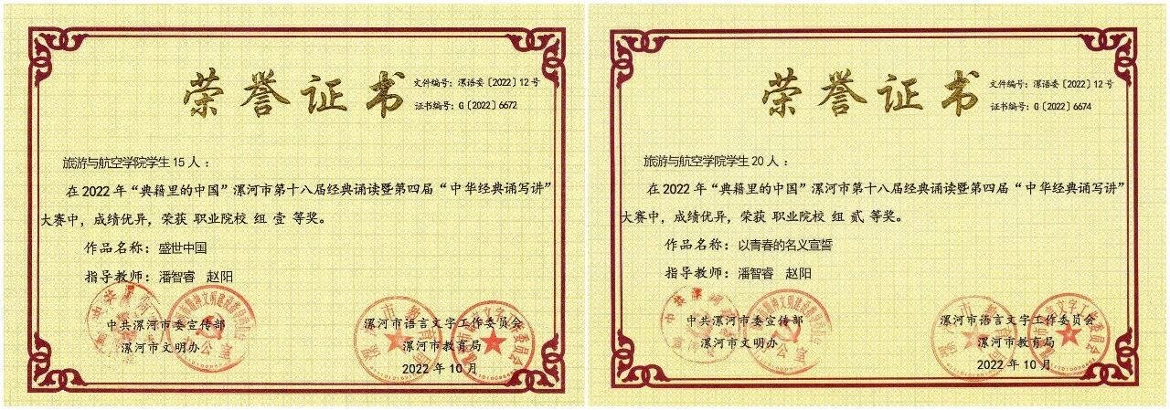 近日,由中共漯河市委宣传部、漯河市文明办、漯河市语言工作委员会、漯河市教育局举办的2022年“典籍里的中国”漯河市第十八届经典诵读暨第四届“中华经典诵写讲”大赛落下帷幕。yl7703永利选送的原创作品《盛世中国》、《以青春的名义宣誓》分别荣获职业院校组一、二等奖。