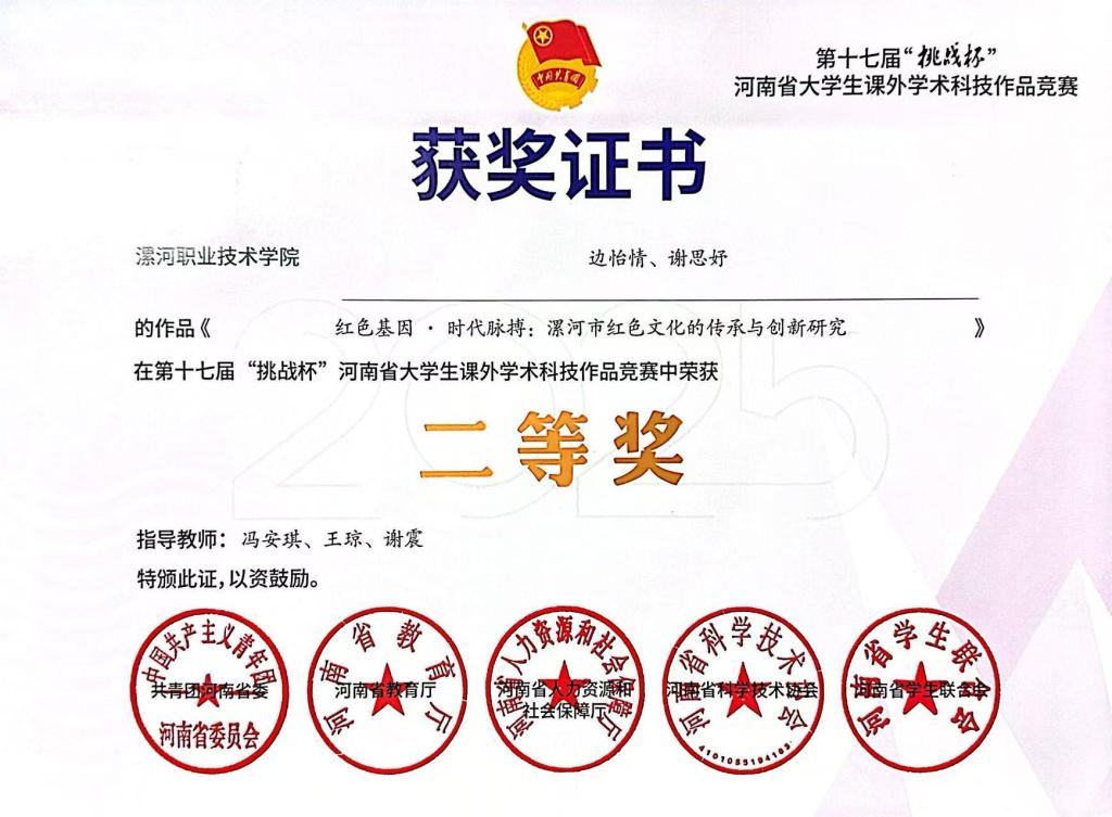 近日,由yl7703永利冯安琪、王琼、谢震三位老师指导,员工边怡情、谢思妤完成的作品《红色基因·时代脉搏:漯河市红色文化的传承与创新研究》,在第十七届“挑战杯”河南省老员工课外学术科技作品竞赛中荣获二等奖。