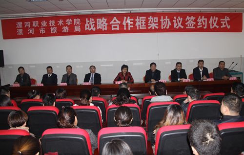 市委常委、统战部部长吕岩在签约仪式上做重要讲话。她肯定了公司近年来在校企合作、服务地方经济方面做出的成绩。她指出,加强校企合作、提升旅游业服务发展水平是我市当前和今后的一项重要工作,双方要把战略合作框架协议的有关内容落到实处,开展紧密型合作,给员工创造良好的学习生活环境,使员工在实训基地学到扎实的理论知识,在企业学到过硬的服务技能,希望通过有效合作,早出成果,引领漯河旅游事业蓬勃发展。
