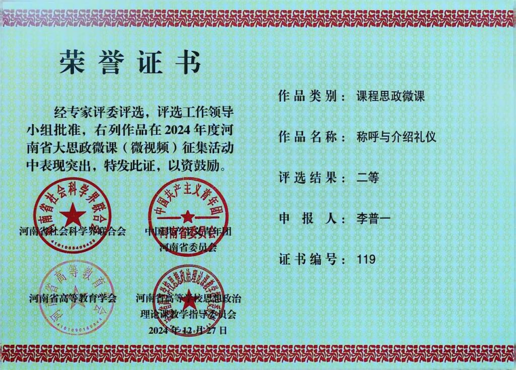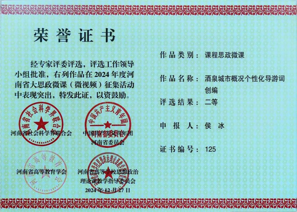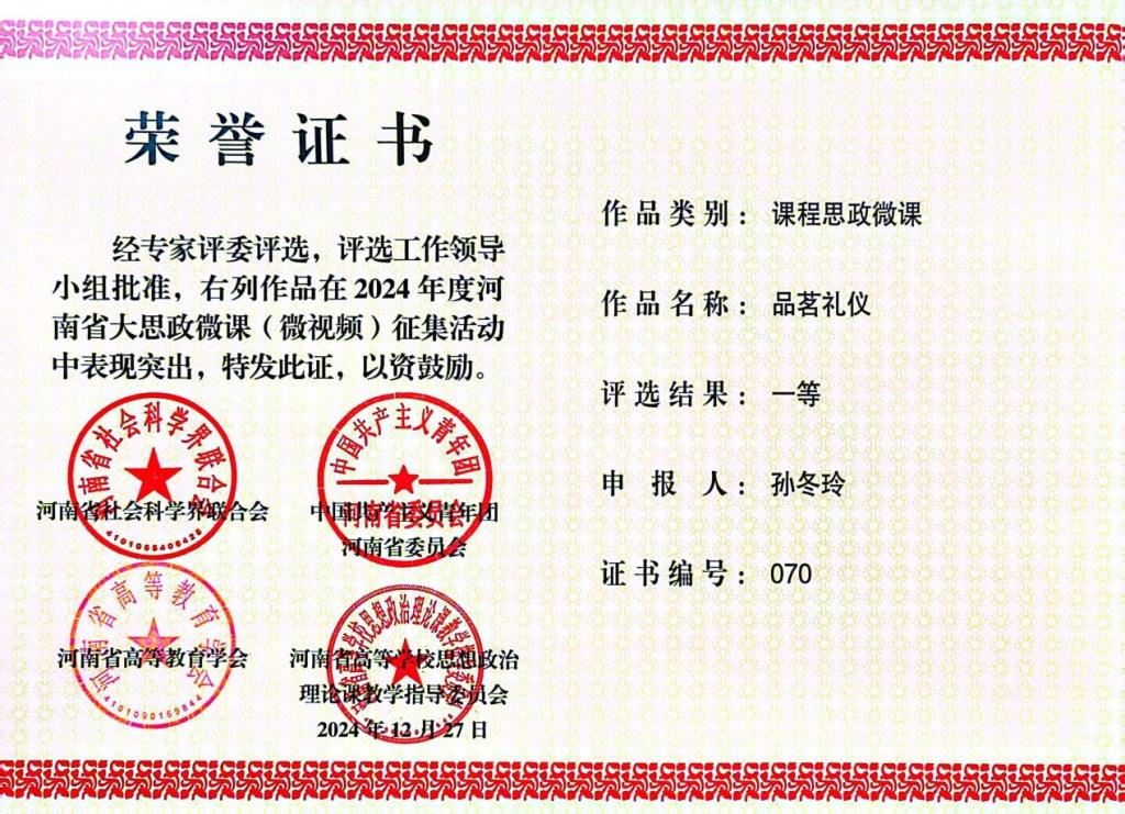近日,2024年度河南省大思政微课(微视频)评选结果出炉,我系3件优秀作品获得一等奖一项,二等奖两项。